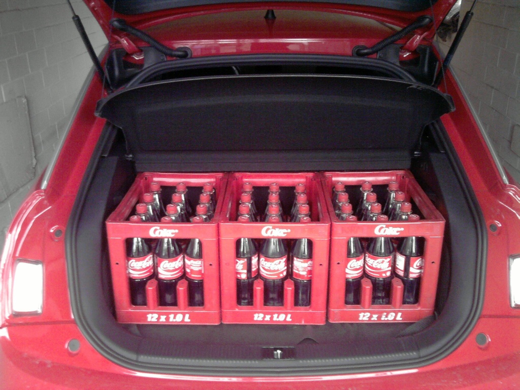 Das Kofferraumvolumen beträgt ziemlich genau 3 Kästen Cola.